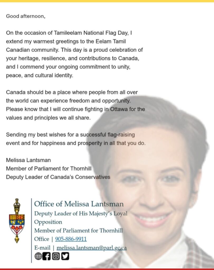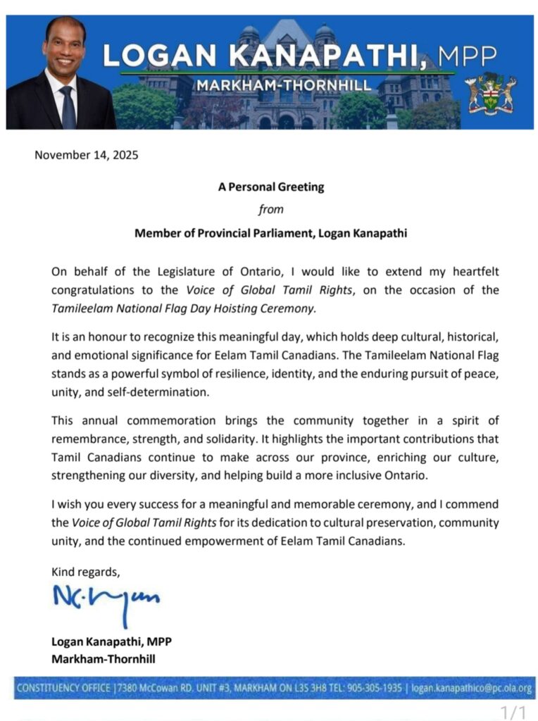 Ontario சட்டமன்றத்தின்பேரில், தமிழீழ தேசியக் கொடி நாள் ஏற்றுதல் விழாவை முன்னிட்டு உலகத் தமிழர் உரிமைக்குரல் அமைப்பிற்கு எனது இதயம் கனிந்த வாழ்த்துகளைத் தெரிவித்துக் கொள்கிறேன். இந்த அர்த்தமிக்க நாளை உணர்ந்து கொள்வது எனக்குப் பெரும் பெருமையாகும். இது ஈழத் தமிழர் கனடியர்களுக்கு ஆழமான பண்பாடு, வரலாறு மற்றும் உணர்வு சார்ந்த முதன்மை வாய்ந்தது. தமிழீழத் தேசியக் கொடி என்பது, அடையாளம், அமைதி, ஒற்றுமை மற்றும் தன்னாட்சிக்கான நிலை, போரற்ற தேடலின் வலிமையான சின்னமாக திகழ்கிறது. இந்த ஆண்டு விழா நினைவு நாள், சமுதாயத்தை நினைவுகூறல், உறுதி, ஒற்றுமை ஆகிய உணர்வுகளுடன் ஒன்றிணைக்கிறது. இது கனடா வாழ் தமிழர்கள் நமது மாகாணத்தில் தொடர்ந்து வழங்கி வரும் சிறப்பான பங்களிப்புகளை உரிய முறையில் வெளிப்படுத்துகிறது, ஈழத்தமிழர்கள் எங்கள் பண்பாட்டை வளப்படுத்துகிறார்கள், பல்வகைப்பாட்டை வலுப்படுத்துகிறார்கள், மேலும் இன்னும் ஒன்டாரியோவை கட்டியெழுப்ப உதவுகிறார்கள். இந்த நிகழ்வு அர்த்தமிக்கதும் நினைவில் நிற்கத்தக்கதுமானதாக அமைய எனது மனமார்ந்த வாழ்த்துக்கள். பண்பாட்டு பாதுகாப்பு, சமூக ஒற்றுமை, மற்றும் ஈழத்தமிழர் கனடியர்களின் தொடர்ந்த முன்னேற்றத்திற்கான தங்களின் அர்ப்பணிப்பிற்காக உலகத் தமிழர் உரிமைக்குரல் அமைப்பை நான் பாராட்டுகிறேன் – Logan Kanapathi