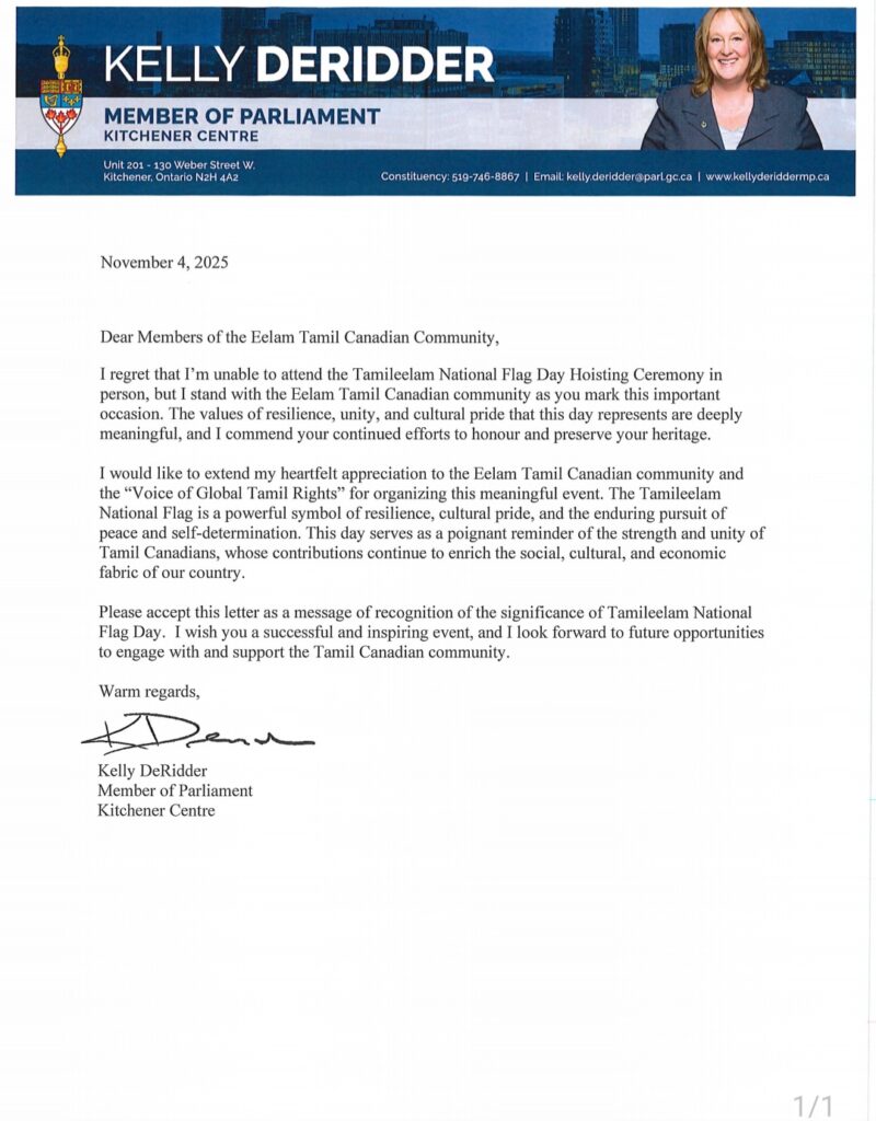 அன்புடைய தோழமைகளே, நவம்பர் 21, 2025 பிராம்ப்டனில் உள்ள Ken Whillans Square-இல் நடைபெறும் தமிழீழ தேசியக் கொடி ஏற்றுதல் விழாவில் கலந்து கொள்கிற அனைவருக்கும் எனது இதயம் கனிந்த வாழ்த்துகளைத் தெரிவித்துக் கொள்வது எனக்கு பெருமையாகும். இந்த நாள், தமிழீழத் தமிழர் கனடிய சமூகத்திற்குப் பெரும் அர்த்தமுடையதாகும். இது தன்னாட்சி, அமைதி, ஒற்றுமை ஆகியவற்றிற்கான உங்கள் ஒருங்கிணைந்த அர்ப்பணிப்பை பிரதிபலிக்கிறது.