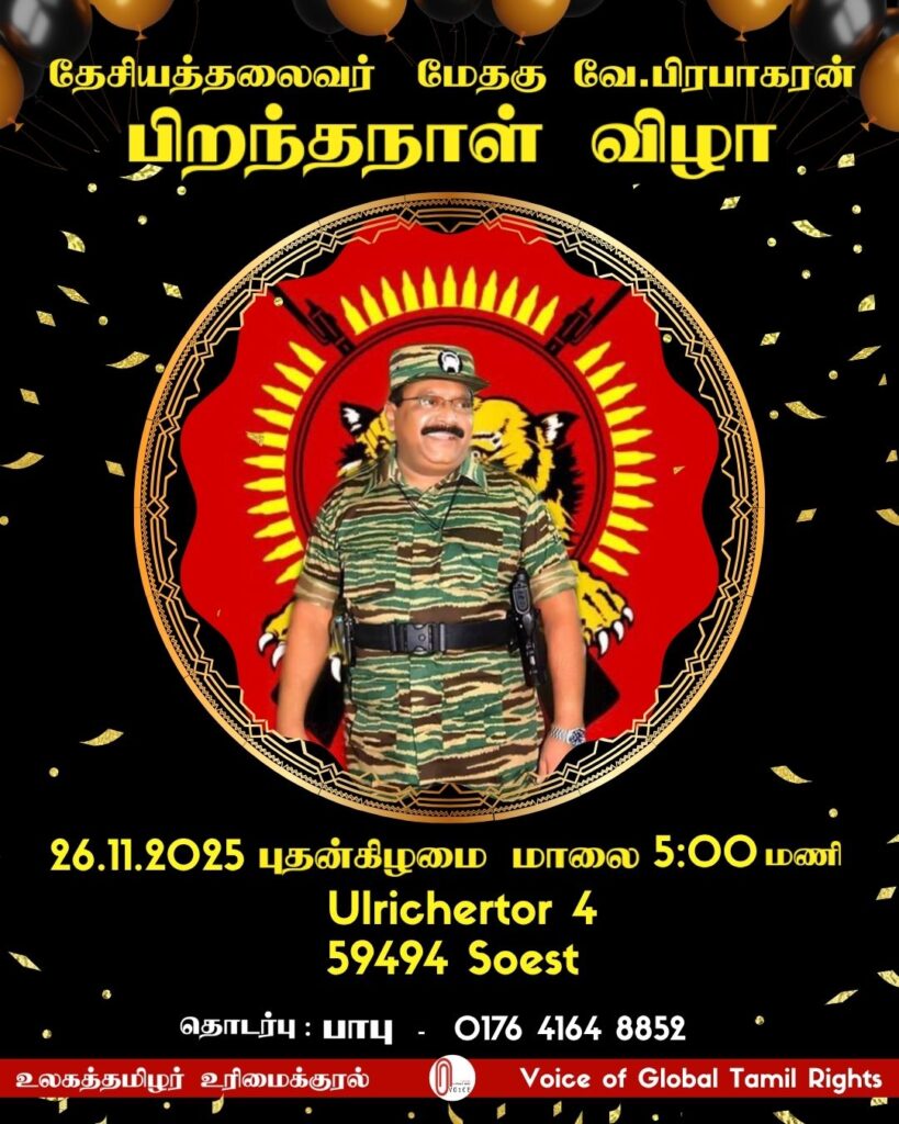 26.11.2025 அன்று தமிழீழத் தேசியத்தலைவர் பிறந்தநாள் (71) விழா யேர்மனியின் Soest நகரத்தில் கொண்டாடப்பட்டது. நிகழ்வில் தமிழீழத்தேசியக்கொடியினை திரு.மதிமாறன் அவர்கள் ஏற்ற; பொதுச்சுடரினை இளையோர் ஏற்றினர்.